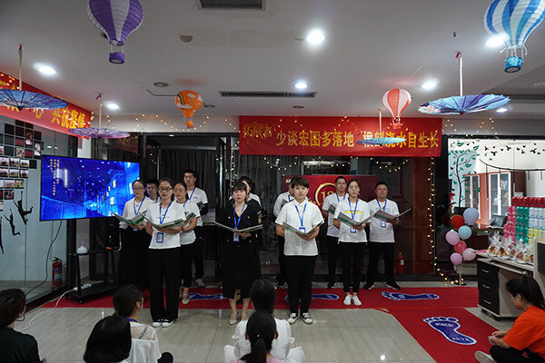 The whole party started with a dance of “Day Day Up” on 9:00 o’clock. Girls in colorful T-shirts showed us the youthful vigor in their dance. And then, we watched a video recording wishes from other colleagues who are still on business trips, who shot the video in advance.