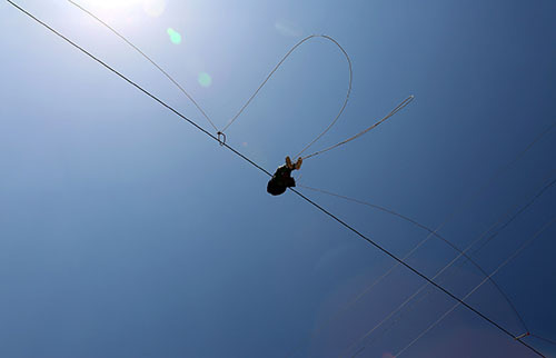 Zipline, also named Zip Wire, Aerial Runway, Death Slide, Flying Fox, etc., consists of a pulley suspended on a cable and usually mounted on a slope. It’s designed to enable a user propelled by gravity to slide from the top to the bottom of an inclined cable by holding on to or attaching to the freely moving pulley.